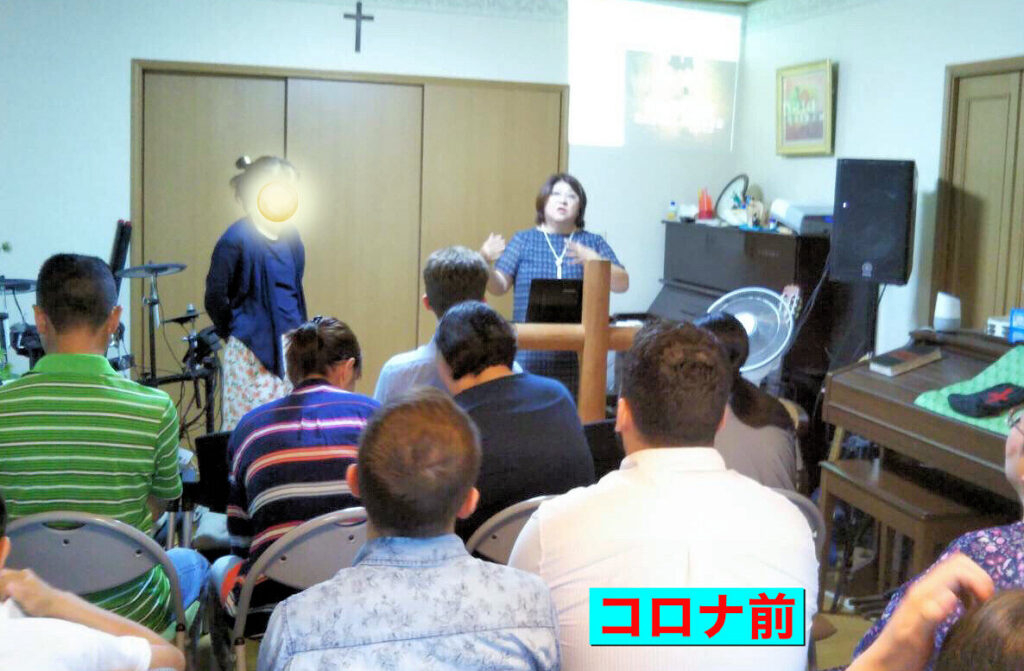コロナ禍での礼拝は、会堂出席と配信(LINE登録制:グループビデオ通話を利用)でおこない、YouTubeでは礼拝の一部録画公開を行っています。祈りの課題や近況報告など個人情報の部分を削って、公開で映るのは牧師だけとしています。 集合型礼拝ができるようになってきた時の会堂内の換気ですが、後方から吸気を行い、前方で強制排気をし、席は同居の家族ごとに座り、高齢者や持病のある方は新鮮な空気の入る吸気窓近くに座るという苦肉の策をとっています。窓が開け放たれているので、冬の間は寒く、窓近くにコタツまで出しました。コタツで礼拝!もう必死な工夫です。